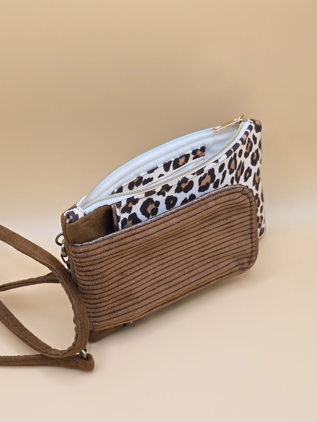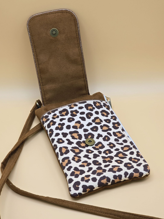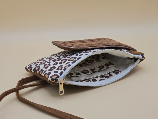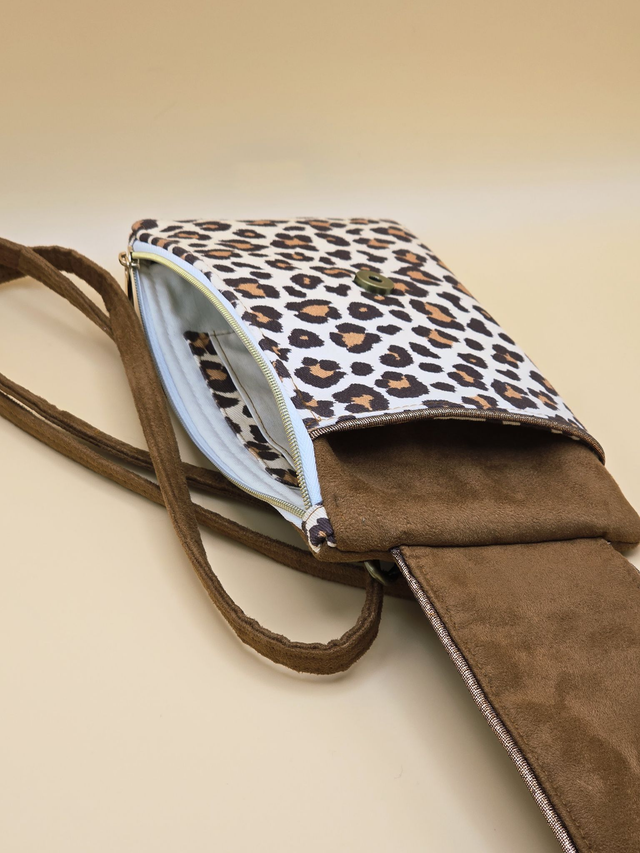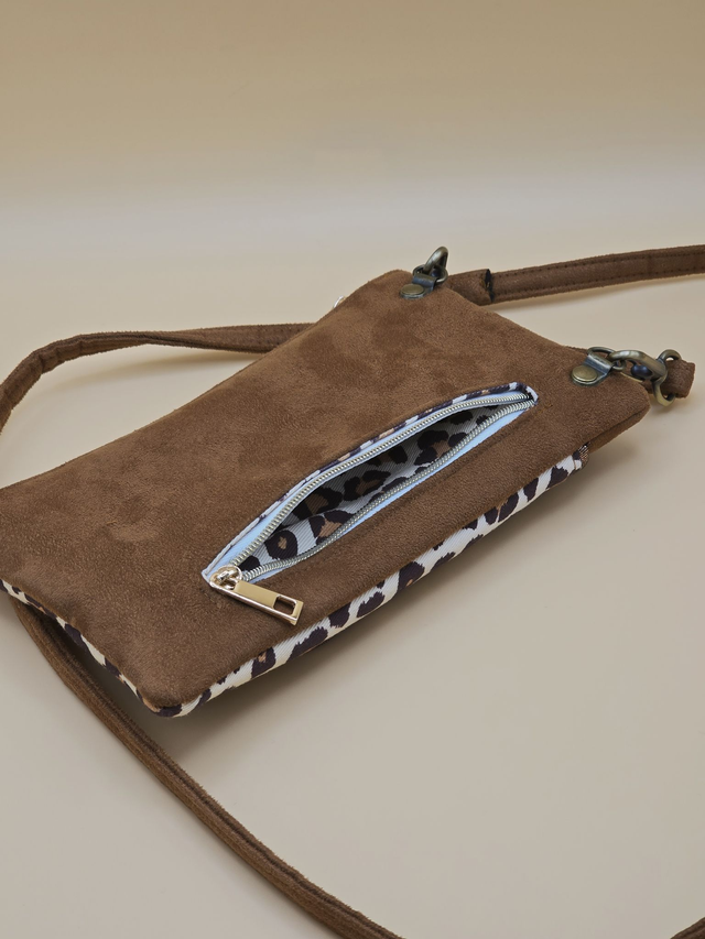 Cousue dans de la suédine couleur noisette et du coton imprimé léopard, cette pochette possède une grande poche plaquée à l’avant pour y glisser votre téléphone, une petite poche zippée à l’arrière pour votre monnaie, et une grande poche zippée au centre avec un porte-cartes pour 4 cartes.