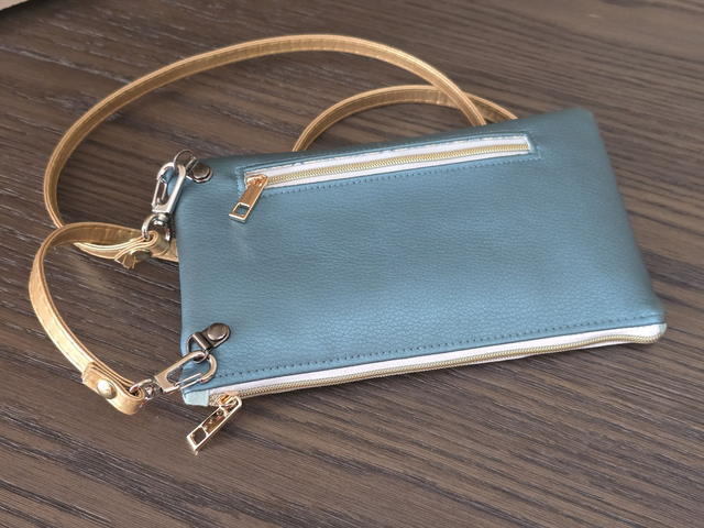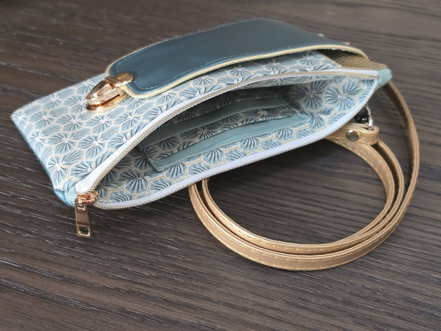 Cousue dans un simili cuir brillant et du coton imprimé, cette pochette possède une grande poche plaquée à l’avant pour y glisser votre téléphone, une petite poche zippée à l’arrière pour votre monnaie, et une grande poche zippée au centre avec un porte-cartes pour 4 cartes.