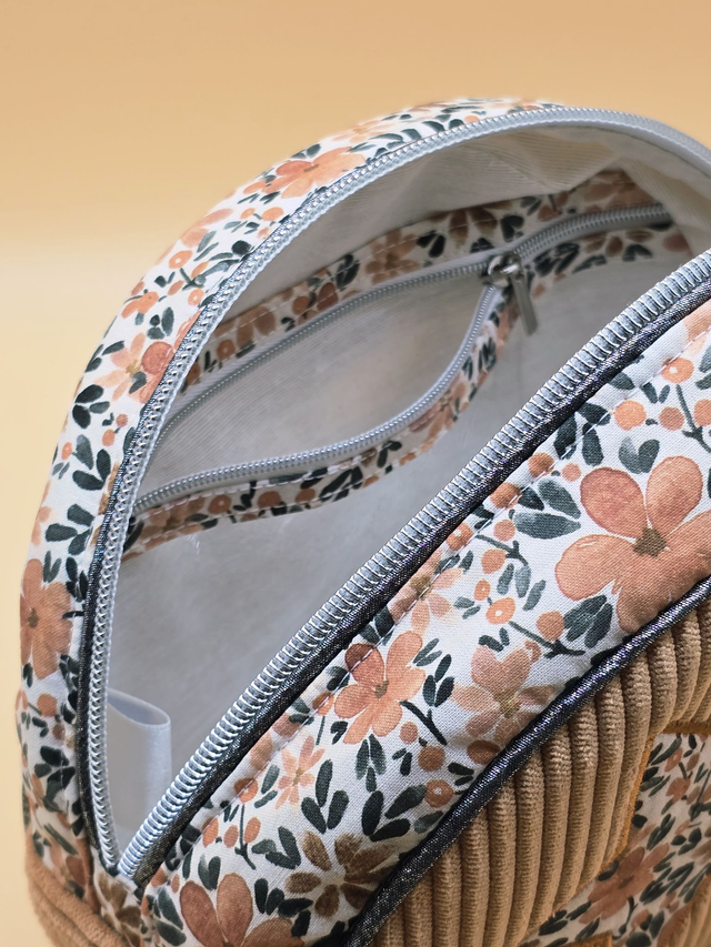 Tissu velours côtelé couleur abricot et coton fleuri assorti.