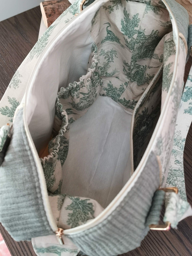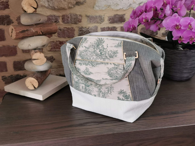 Fond en simili cuir, extérieur en velours et coton "Toile de Jouy", intérieur en coton