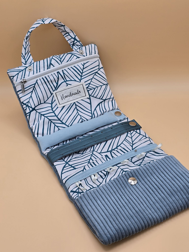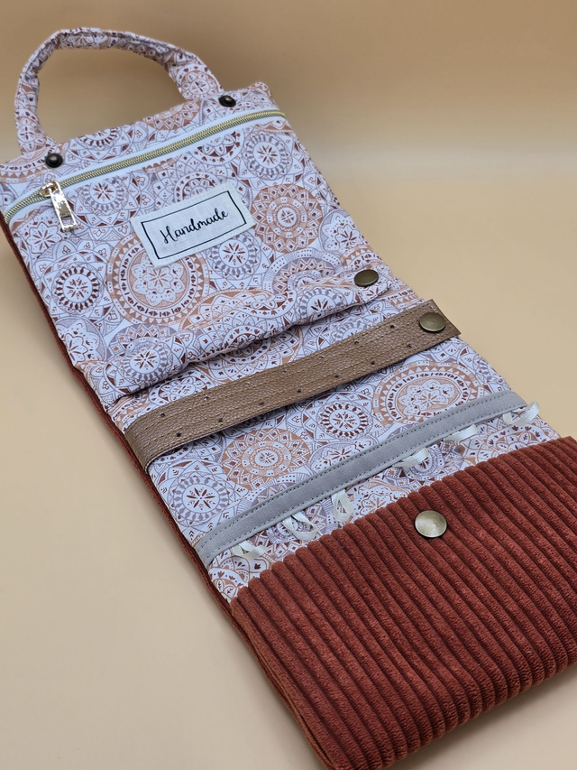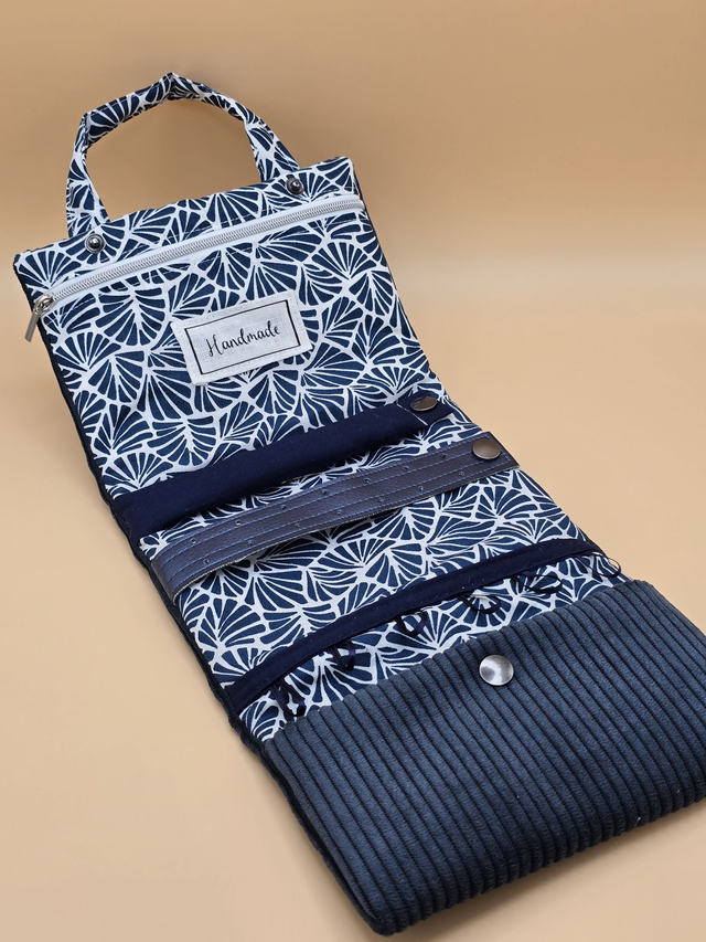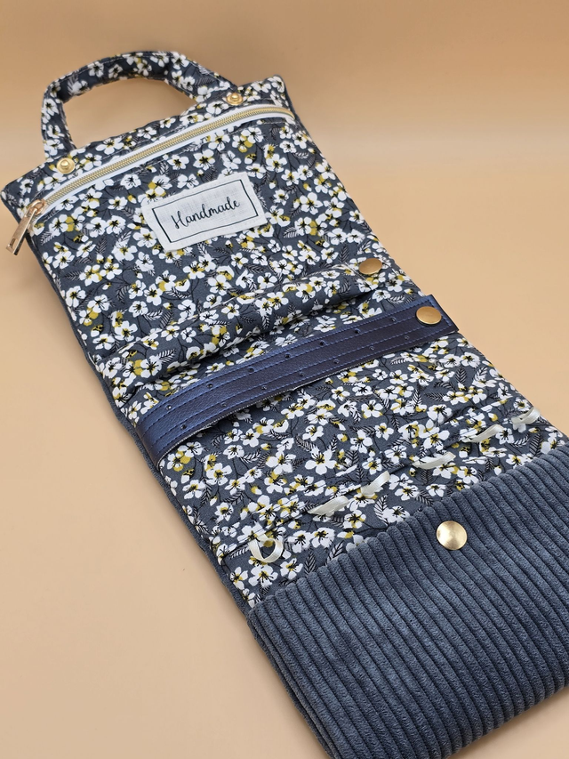 Une poche zippée accueillera vos bracelets. Un petit boudin servira à porter vos bagues. Vous pourrez même fixer vos boucles d’oreilles sur une bande de simili cuir !