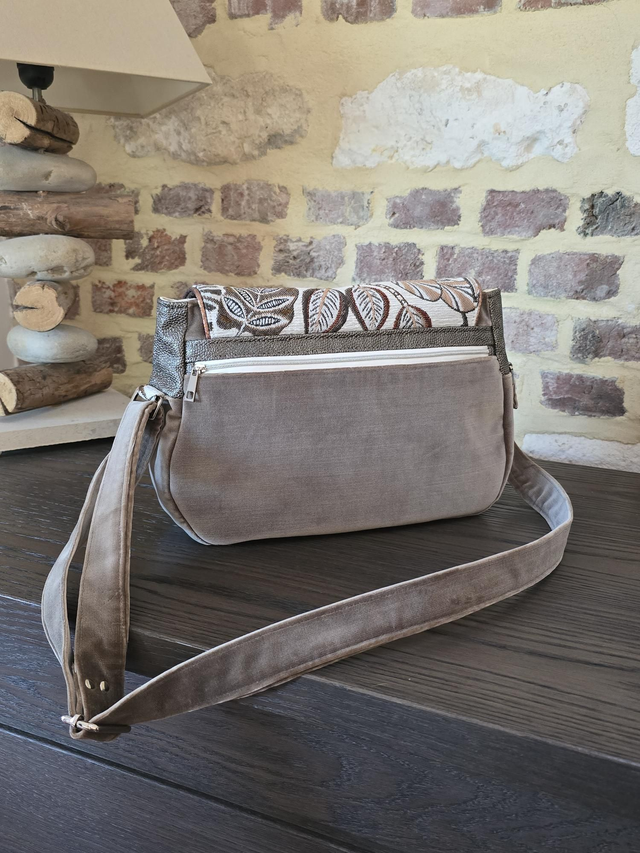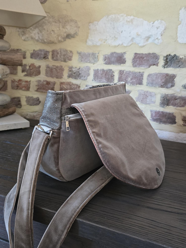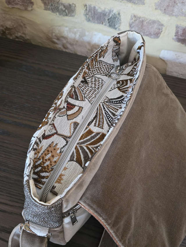 Ce sac est un modèle unique. Il a été cousu dans du velours ras d’ameublement, du jacquard, du tissu déperlant pour les doublures et quelques touches de simili cuir brillant.